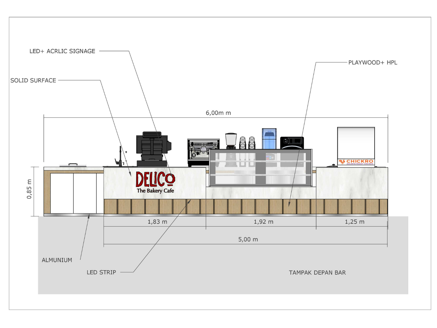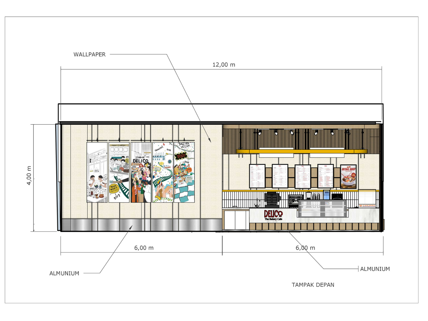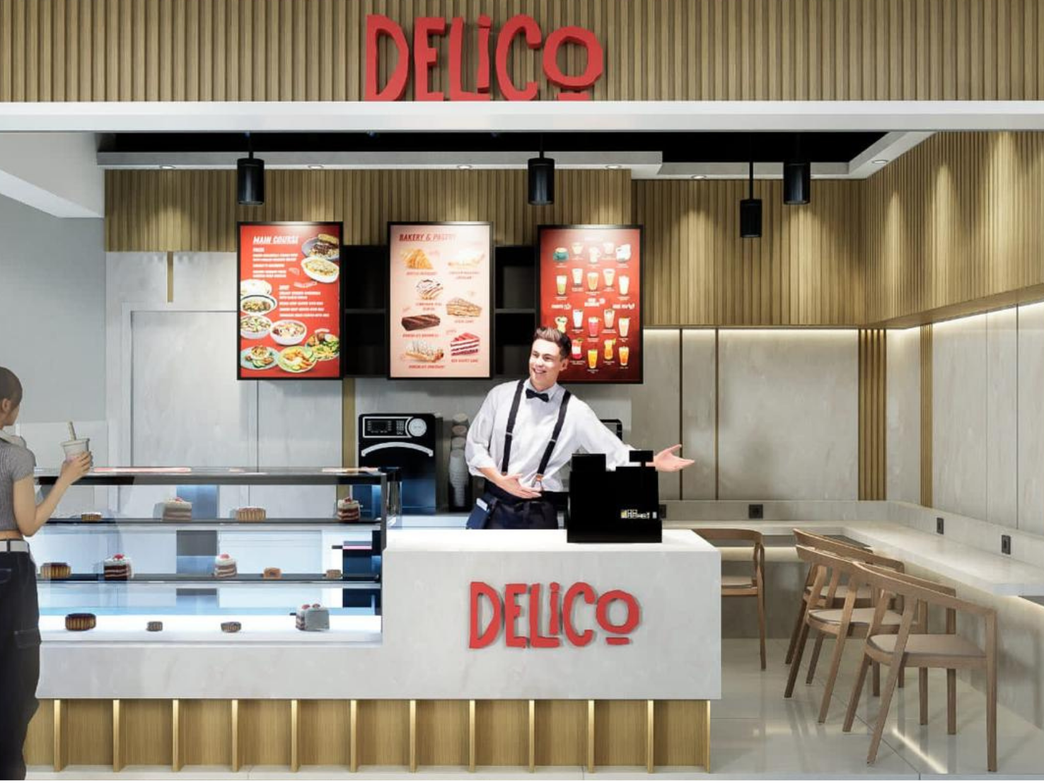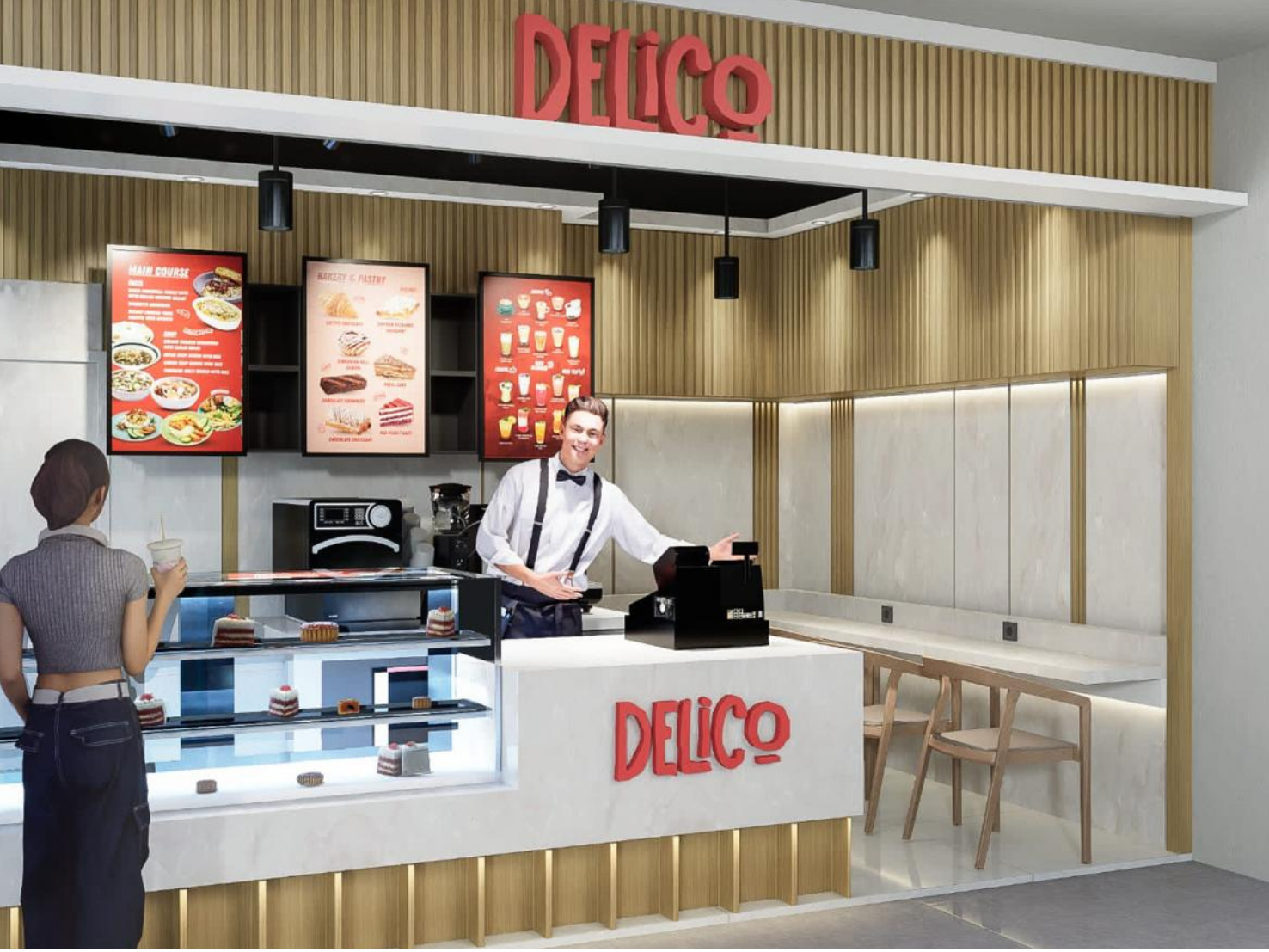DELICO adalah cafe yang berada di Jakarta yang memiki 9 cabang. Pada proses design ini Delico mempunyai new branding image menjadi lebih modern, simple, dan cozy. Rebranding dilakukan sebagai respons terhadap perubahan target pasar, perkembangan tren, serta kebutuhan penyegaran identitas merek. Tujuan dari perubahan ini adalah untuk menciptakan suasana yang lebih modern, meningkatkan engagement pelanggan, serta menonjolkan karakter brand yang lebih kuat dan relevan. Design dan Renovasi Delico dengan konsep pelayanan cepat pada restoran mengacu pada sistem layanan yang dirancang untuk menyajikan makanan kepada pelanggan dalam waktu singkat, tanpa mengorbankan kualitas dan pengalaman pelanggan. Konsep ini banyak digunakan pada restoran cepat saji. Lokasi implementasi desain ini mencakup: - Terminal 3 Bandara Internasional Soekarno Hatta - Jakarta Eye Center (JEC) Kedoya