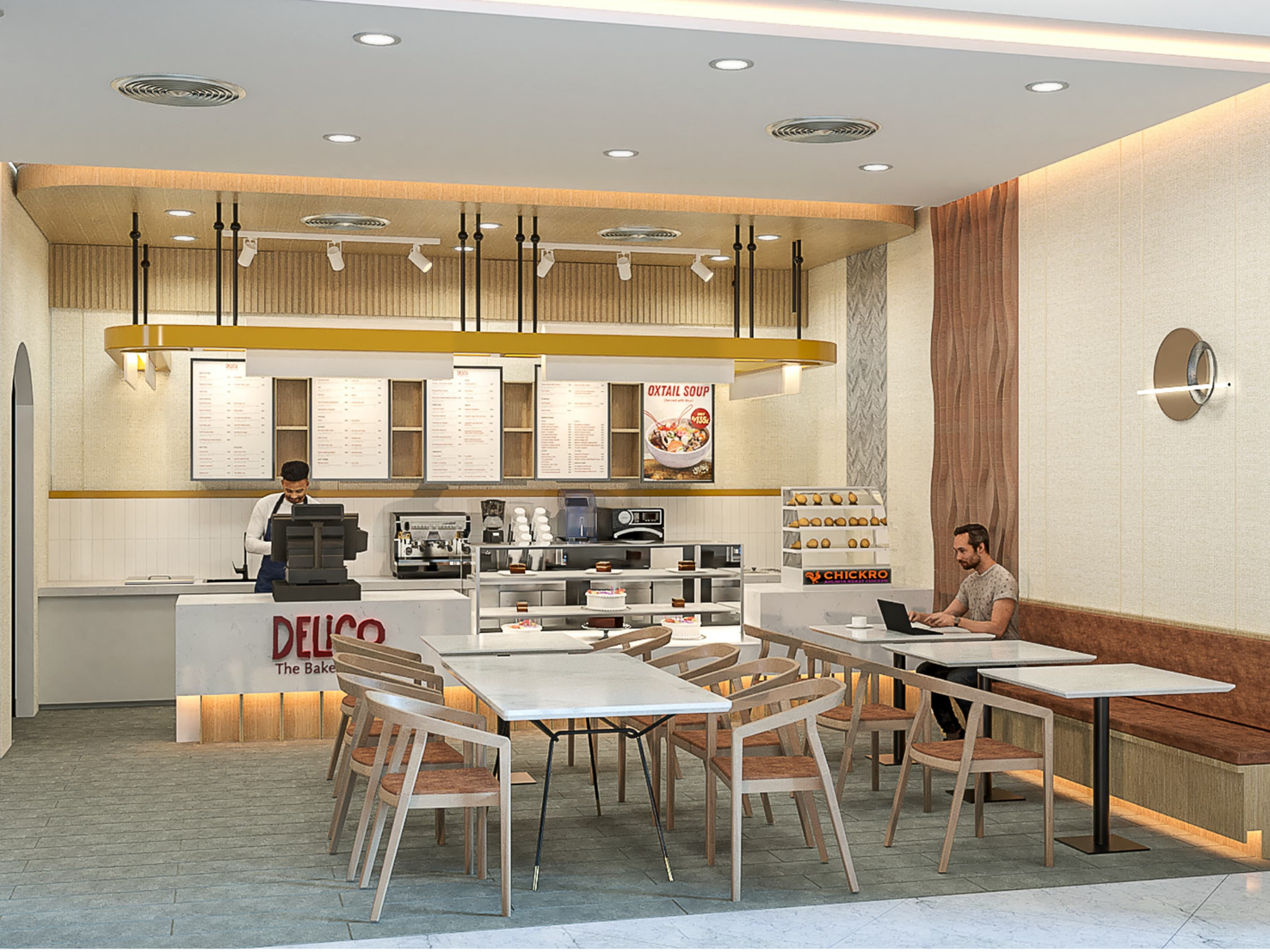 DELICO adalah cafe yang berada di Jakarta yang memiki 9 cabang. Pada proses design ini Delico mempunyai new branding image menjadi lebih modern, simple, dan cozy. Rebranding dilakukan sebagai respons terhadap perubahan target pasar, perkembangan tren, serta kebutuhan penyegaran identitas merek. Tujuan dari perubahan ini adalah untuk menciptakan suasana yang lebih modern, meningkatkan engagement pelanggan, serta menonjolkan karakter brand yang lebih kuat dan relevan. Design dan Renovasi Delico dengan konsep pelayanan cepat pada restoran mengacu pada sistem layanan yang dirancang untuk menyajikan makanan kepada pelanggan dalam waktu singkat, tanpa mengorbankan kualitas dan pengalaman pelanggan. Konsep ini banyak digunakan pada restoran cepat saji. Lokasi implementasi desain ini mencakup: - Terminal 3 Bandara Internasional Soekarno Hatta - Jakarta Eye Center (JEC) Kedoya